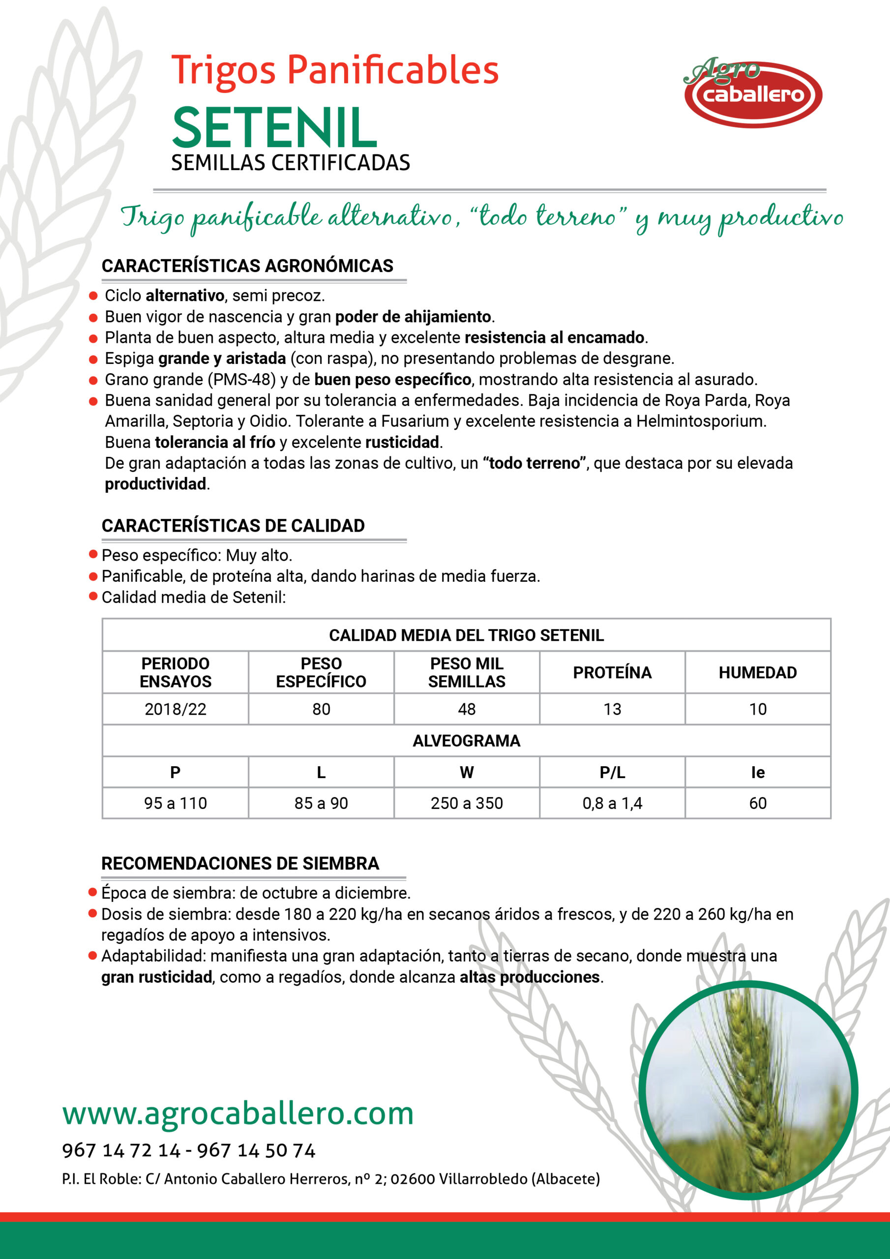 - Dosis de siembra: desde 180 a 220 kg/ha en secanos áridos a frescos, y de 220 a 260 kg/ha en regadíos de apoyo a intensivos.