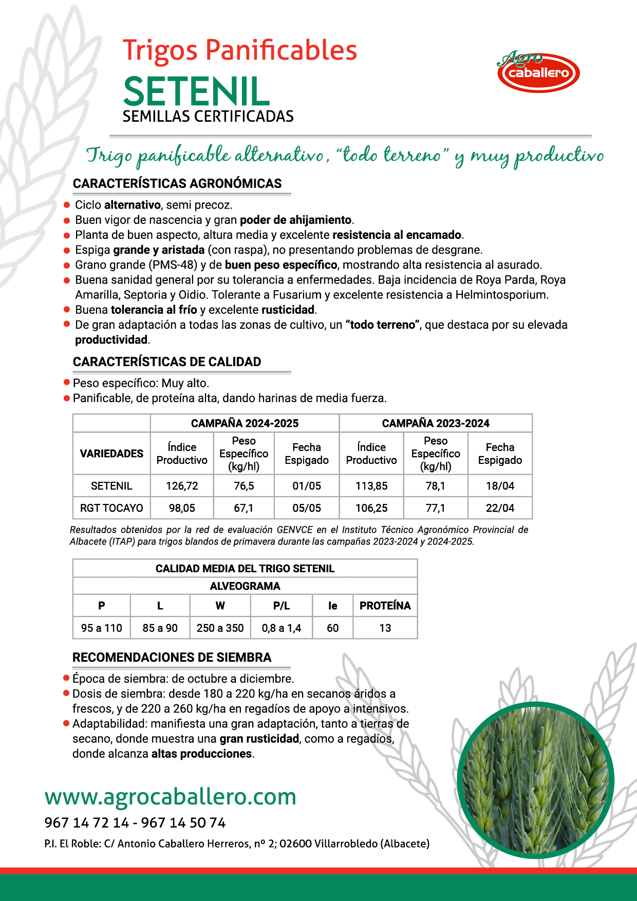 Resultados obtenidos por la red de evaluación GENVCE en el Instituto Técnico Agronómico Provincial de Albacete (ITAP) para trigos blandos de primavera durante las campañas 2023-2024 y 2024-2025.